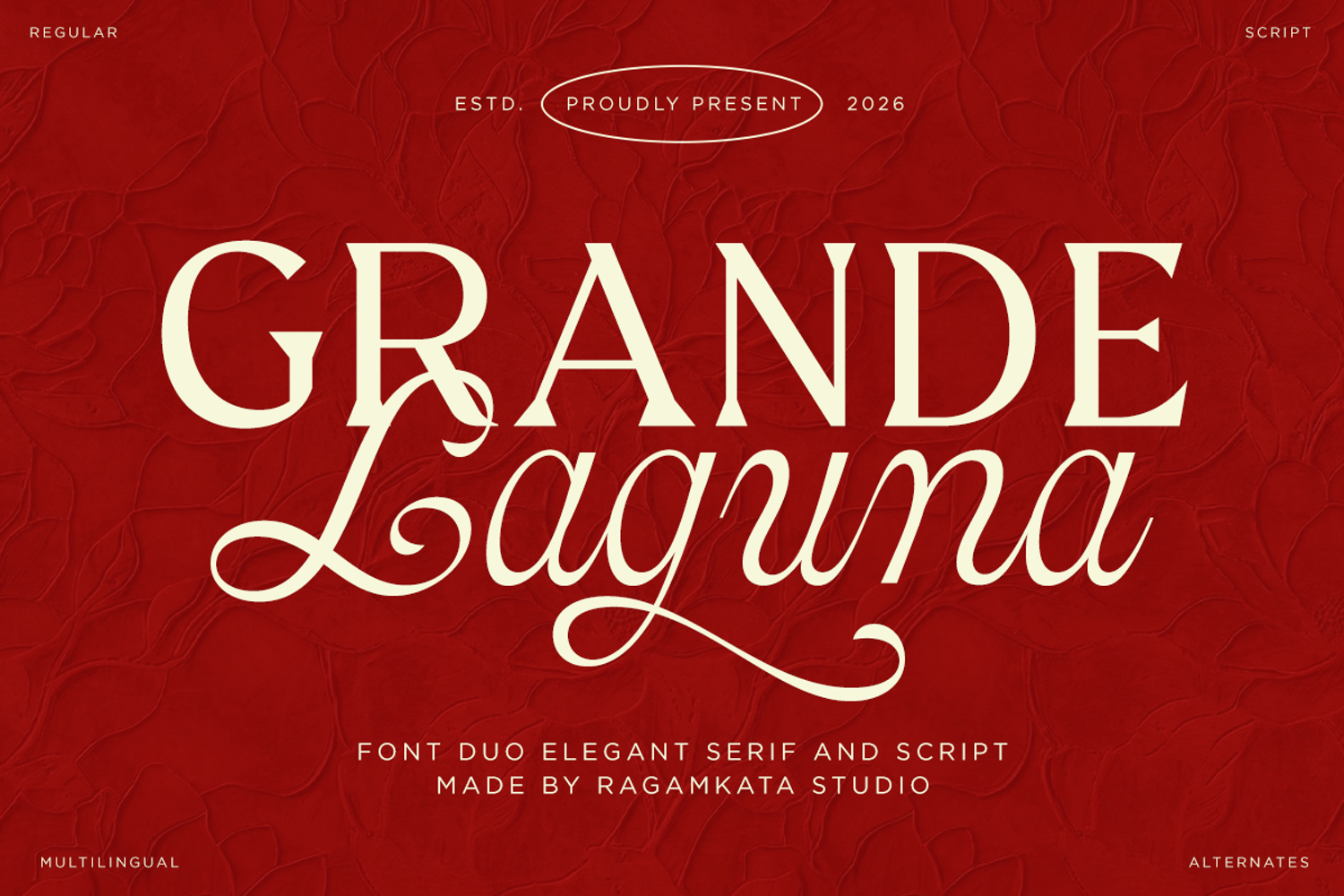 Grande Laguna is an elegant font duo that beautifully blends a refined serif with a graceful script. Designed to create harmony between structure and fluidity, it delivers a luxurious and timeless aesthetic that instantly elevates any design. The serif provides a strong and sophisticated foundation, while the script adds a touch of charm and expressive movement.