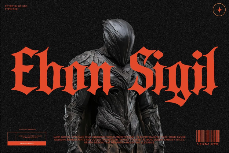 Ebon Sigil is a powerful blackletter typeface that embodies mystery, strength, and dark elegance. Inspired by medieval manuscripts, ancient sigils, and occult symbolism, this font captures the haunting beauty of gothic art. Its bold, angular strokes and dramatic contrast make it perfect for metal band logos, fantasy titles, horror posters, or any design that seeks a sense of mystic grandeur.