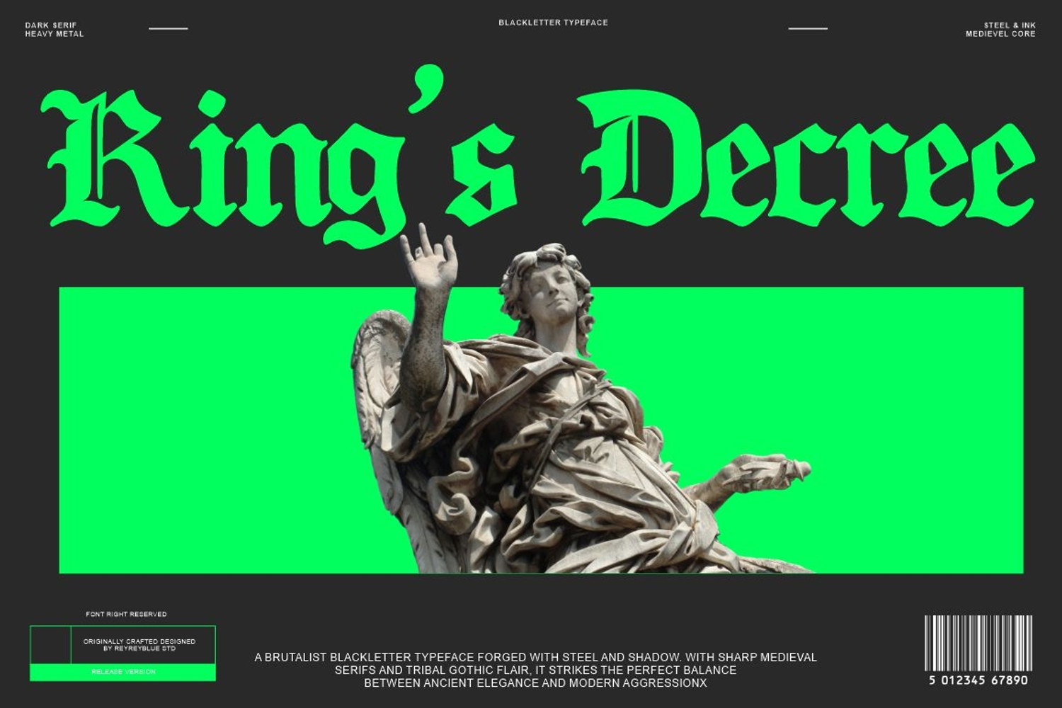 King’s Decree is a bold and commanding blackletter font inspired by medieval calligraphy, royal manuscripts, and gothic architecture. Designed to evoke the power of ancient kingdoms and timeless authority, this font brings a dramatic, elegant, and dark aesthetic to any design.