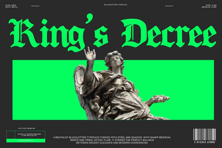 King’s Decree is ideal for designers seeking a gothic font, medieval font, or Old English font that stands out with elegance and authority.