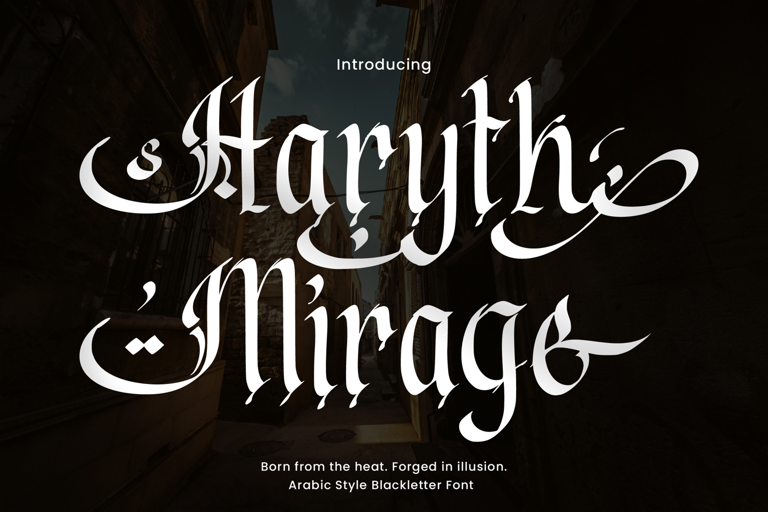 This typeface carries that spirit — bold blackletter structures infused with subtle Arabic character. Sharp strokes, dramatic curves, and a powerful silhouette make it perfect for cinematic posters, game branding, metal aesthetics, and statement logos that refuse to be ignored.