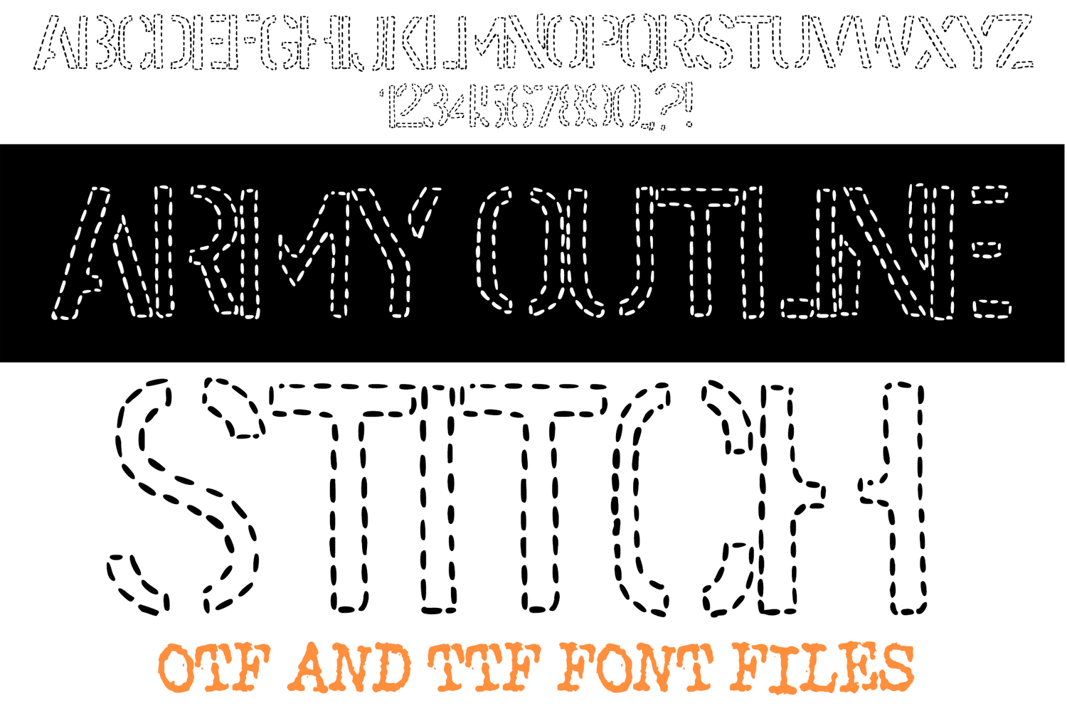 If you're looking to infuse your designs with a sense of bold precision, unique texture, and undeniable visual intrigue, Army Outline Stitch Font is your ultimate tool. Stitch your message with impact!