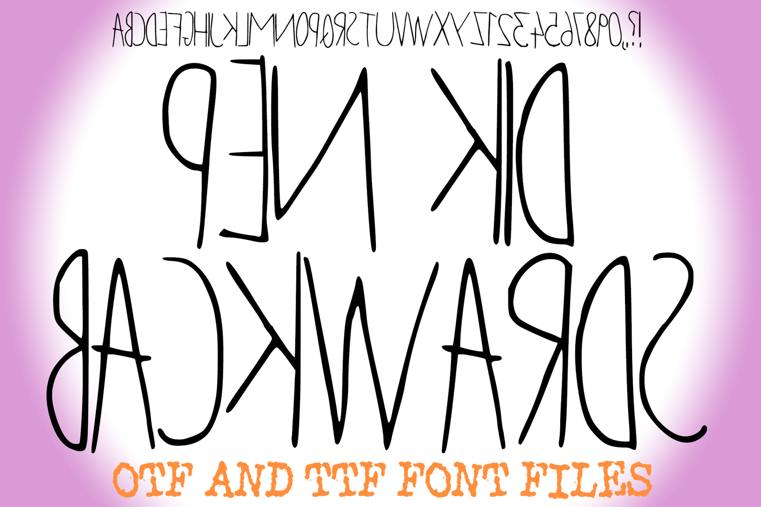 Turn expectations on their head and inject a whimsical twist into your designs with Pen Kid Backwards Font! This wonderfully unconventional typeface is meticulously crafted to mimic a child's enthusiastic handwriting, but with each character playfully flipped as if seen in a mirror. It's more than just a font; it's an intriguing optical illusion and a delightful puzzle, perfect for projects that demand a second glance and a memorable, quirky flair.