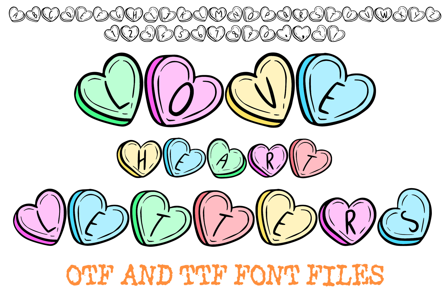 Sweeten your creative projects with the Love Heart Letters Font! This charming display typeface captures the whimsical essence of classic Valentine’s Day candy hearts. Every uppercase letter and number is individually contained within a colorful, glossy heart featuring thick black outlines and soft highlights for a professional, high-impact look.