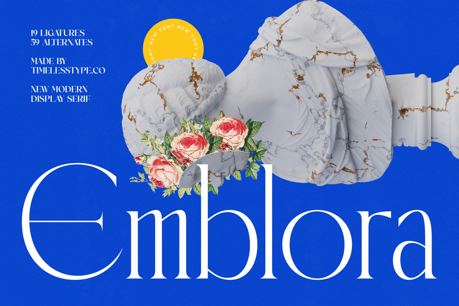 Unleash a world of creative possibilities with its rich typographic features. Boasting 19 ligatures and an impressive 59 alternates, Font Emblora - Modern Display Serif Serif Display offers exceptional customization for your projects. These extensive options empower designers to craft truly unique headlines, distinctive logos, and compelling branding that exudes a bespoke and artistic touch.