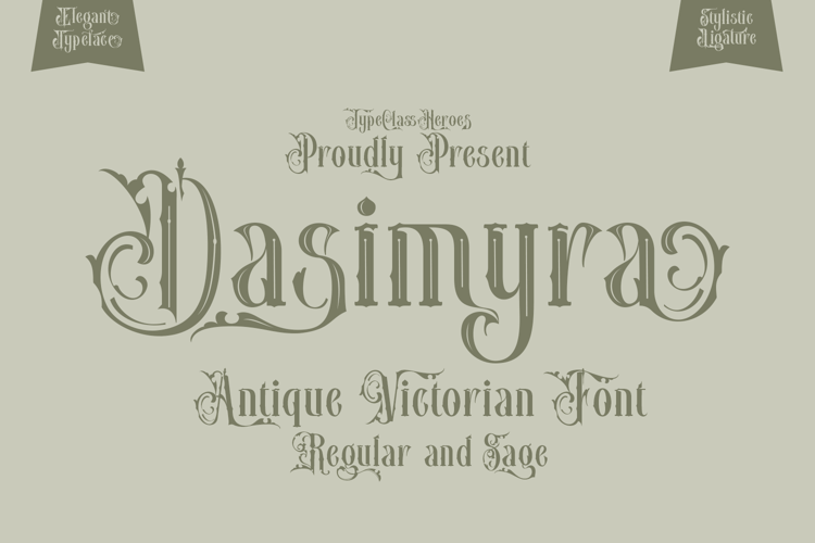 Introducing Dasimyra antique Victorian typeface, a classic and ornate font that embodies the majestic elegance of the Victorian era, creating a luxurious and authentic feel. This typeface conveys a timeless sense of luxury and professionalism with its classy character and harmonious visual balance. It is ideal for branding applications that aim to emphasize an exclusive, trustworthy, and authoritative image. Dasimyra enhances any project with its distinctive style and refined aesthetic, making it perfect for upscale branding, invitations, and elegant packaging.