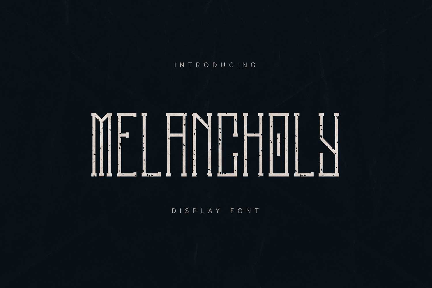 Melancholy blends architectural structure with expressive character. The narrow spacing and elongated shapes give it a powerful rhythm, making it ideal for bold headlines and visually driven compositions. Its distinctive style brings a sense of tension, emotion, and modern sophistication.