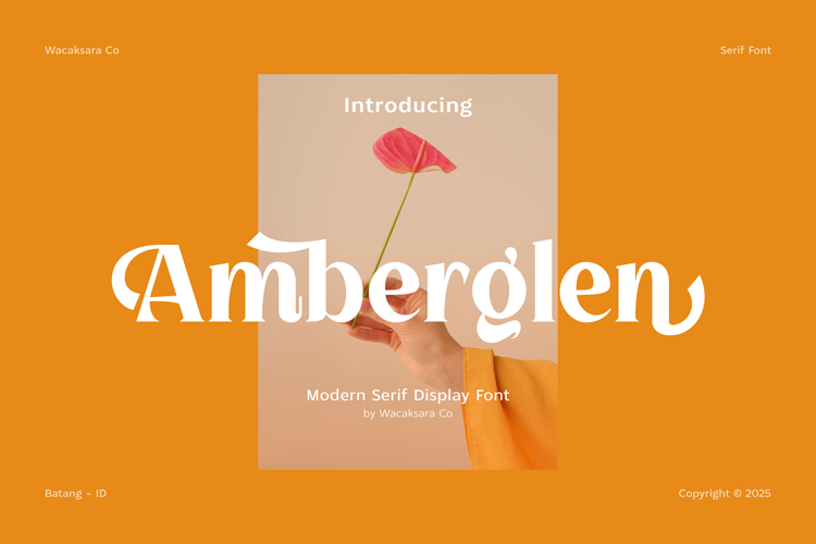 Amberglen is a classy and feminine modern serif display font with elegant curves and a soft touch. Designed to bring warmth and sophistication to your work, this typeface shines in branding, packaging, beauty products, editorials, wedding invitations, and sosial media.