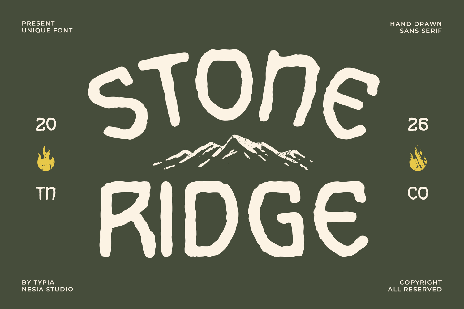 Stone Ridge is a rough vintage hand-drawn sans font inspired by rugged landscapes and outdoor adventure culture. Crafted with textured strokes and organic imperfections, this typeface blends retro charm with rustic authenticity, creating a bold and naturally rugged character. Its distinctive style makes it perfect for logo design, branding, packaging, posters, badges, outdoor adventure themes such as camping brands, mountain-inspired graphics, lifestyle packaging, adventure promotions, and any project that needs a powerful, grounded, and authentic visual presence.