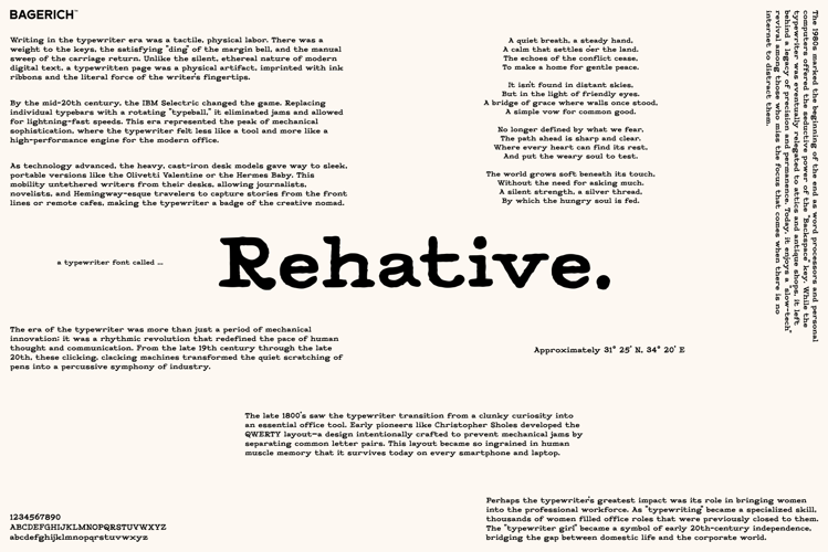 Perfect for editorial layouts, nostalgic branding, and storytelling, this font brings a "percussive symphony" to the screen. Whether you are channeling the spirit of a Hemingway-esque traveler or designing a clean, modern interface with a vintage soul, Rehative offers a unique blend of sharp precision and organic warmth. It celebrates the legacy of the QWERTY layout and the legendary IBM Selectric, providing a versatile tool for the "creative nomad" who wants their work to stand out with the permanence and authority of a typewritten page.